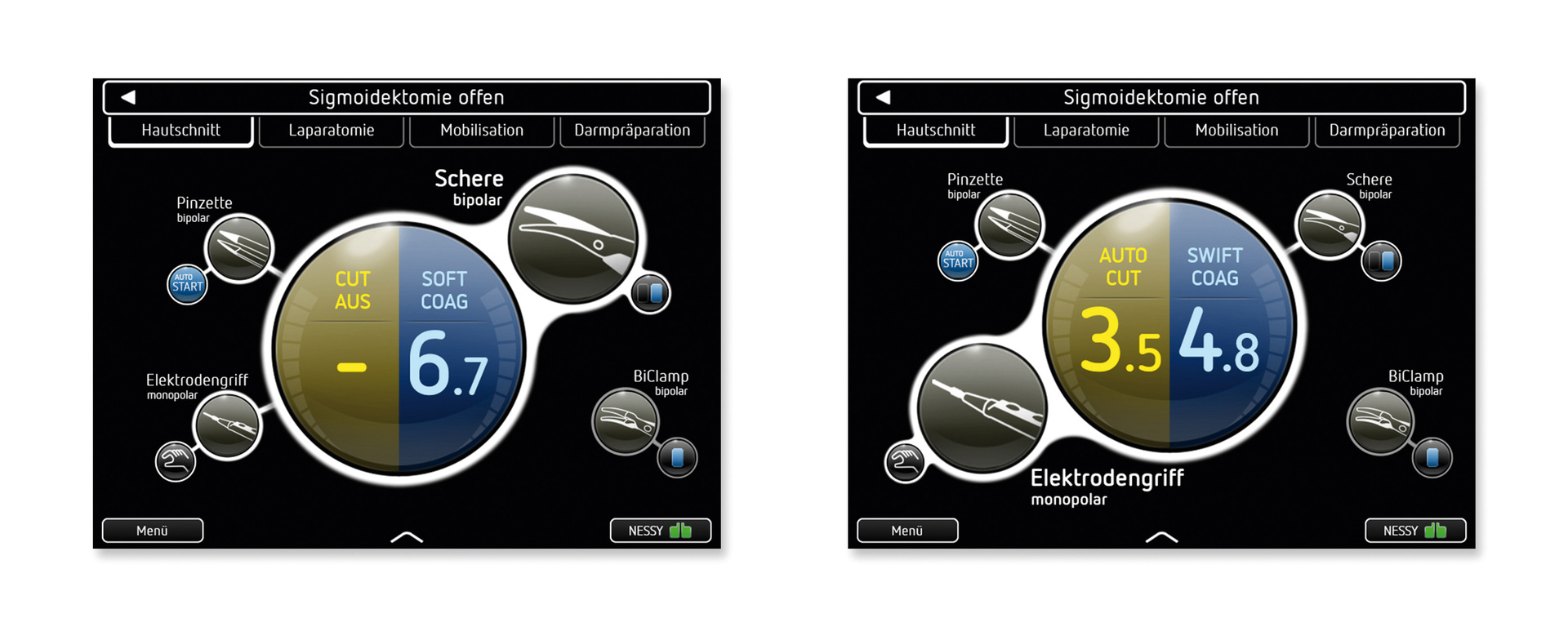 The interface of the VIO 3 electrosurgery unit enables surgery staff to operate the device easily via a 10.4” touchscreen. The “stepGuide” tool leads the user through preset surgery programmes with all the necessary instruments. The main screen’s central sphere is divided into two parts, displaying the core functions of electrosurgery: cutting and coagulation. Both can be utilised with a variety of different instruments and activation devices. Visualised in an arrangement that resembles surrounding planets and satellites, these are easily assigned.