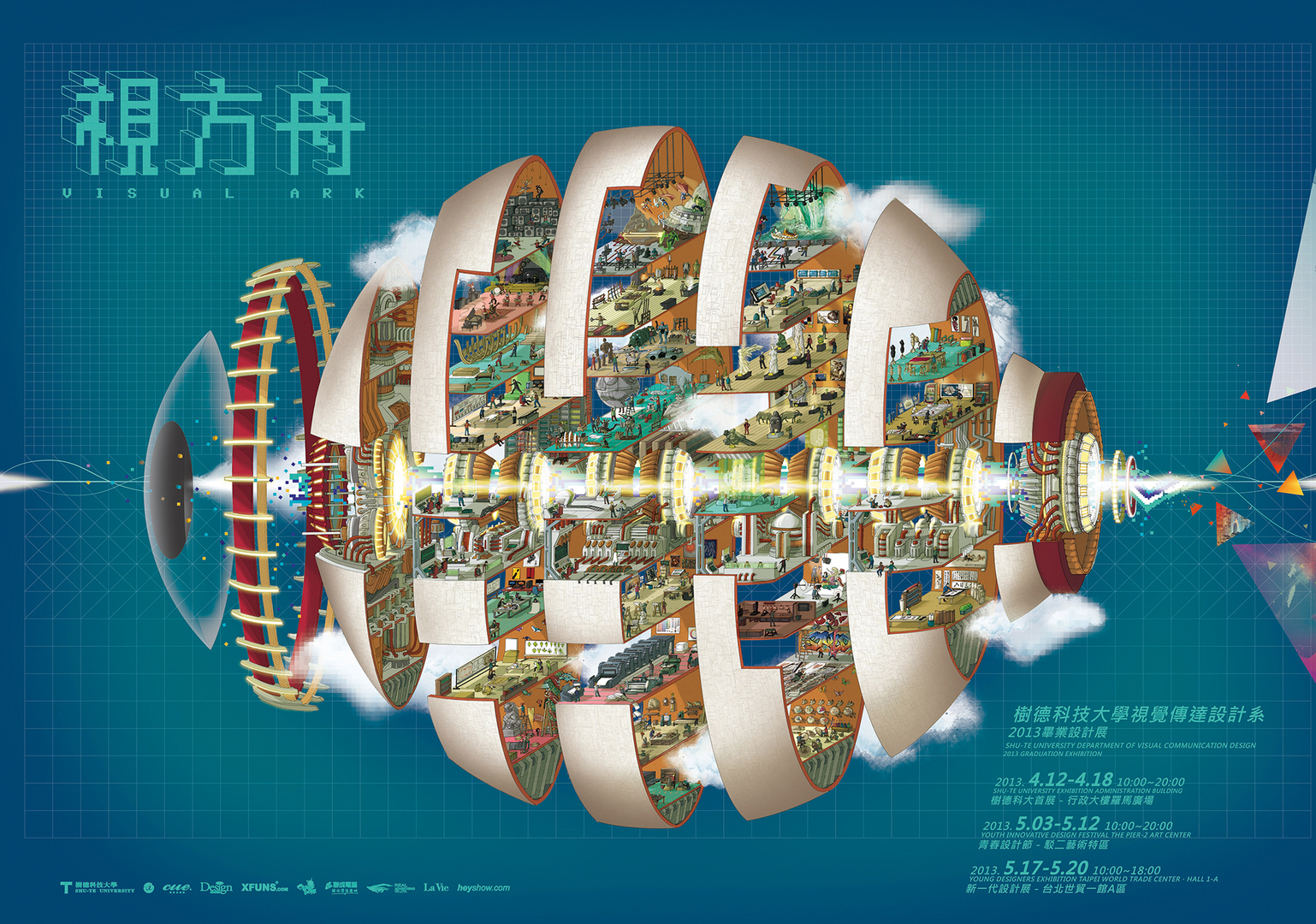This poster shows Visual Ark, an eye-shaped object with a world of design options opening up behind the iris and the pupil. The colour illustration depicts this world as a cluster of spaces. Each space is a place where creativity can unfold, therefore offering the possibility of creating new styles of visual effects with a wide range of different materi-als. One can make out a museum as well as a tailor’s workshop, a painting room, a printing work and a wood workshop. The many fine details of the illustration are made visible with the help of a magnifying glass. The interaction between the peripheral magnifying glass and the poster is used to represent the meanings of “observation” and “searching”.