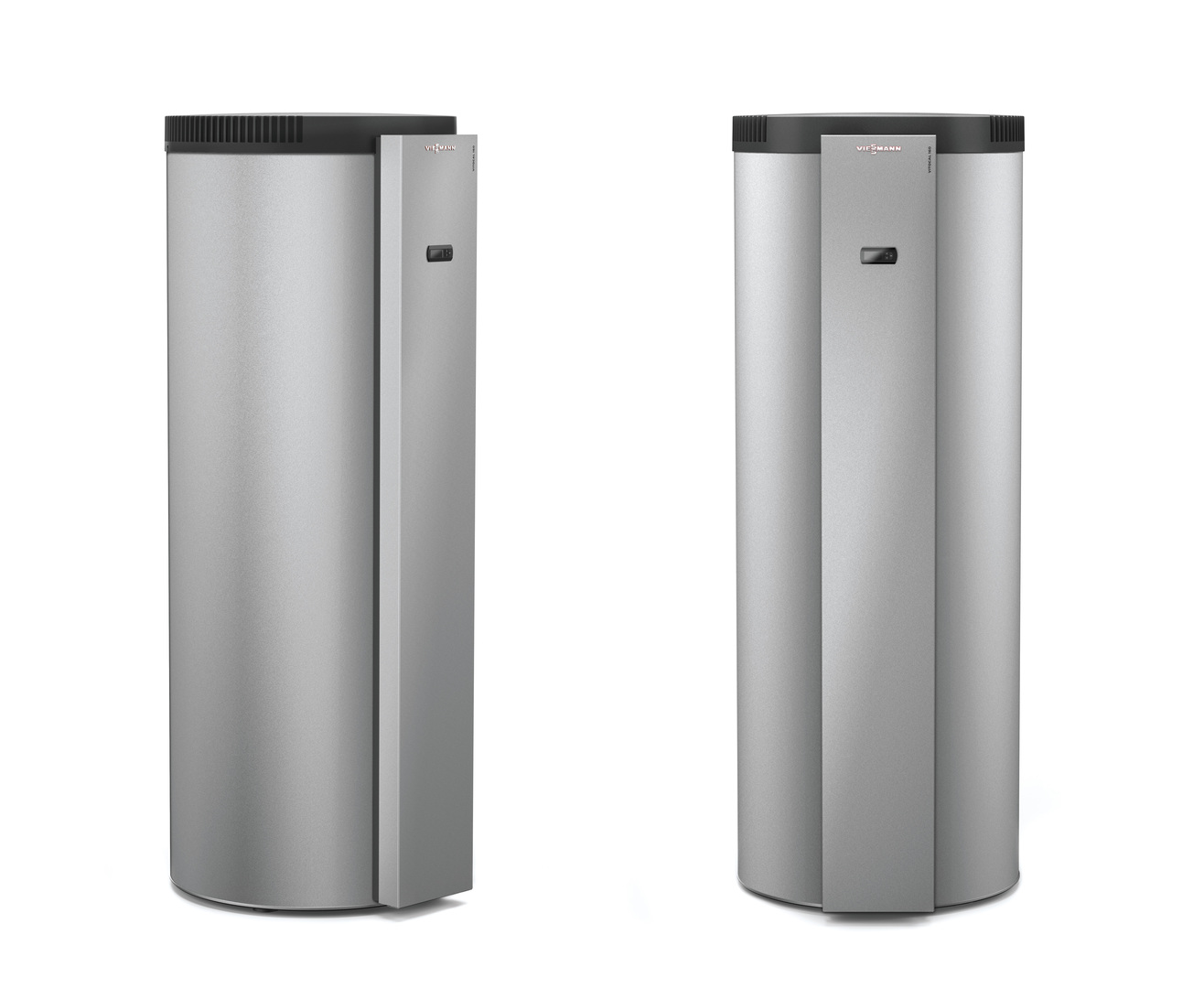 The warm water heat pump Vitocal 161-A is a sustainable and environmentally friendly unit that derives heat for warm water from the ambient room temperature. The resulting cooler air is used to ventilate and cool living quarters. The cylinder’s powerful design is contrasted by the calm, geometric form of the vertical panel that hides the technical elements. This results in operating controls that are easy to understand and have been reduced to the essentials. The compact, space-saving housing contains not only the heat pump but also a 300-litre boiler. This integrative design concept contributes to a reduction of complexity and provides maximum benefits and convenience for the user.