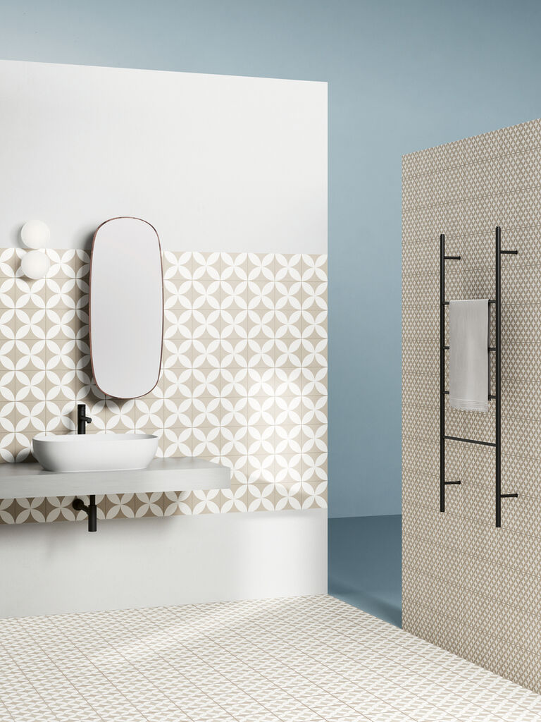 Retromix is a collection of porcelain tiles that reinterprets traditional graphic patterns in a new way. The square wall and floor tiles are available on the one hand in ethnic colours that give a sense of the past and create the impression of handcrafted work. The collection however also offers tiles with a strong black-and-white contrast to create graphical effects through the interplay with a warm and a cool cement grey. This vast range of choices means the collection easily fits into different contemporary interiors.