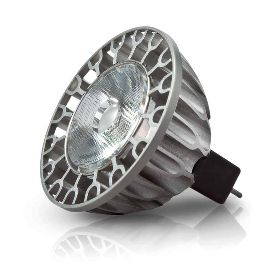 This LED lamp produces the entire colour spectrum in an innovative way. The lamp uses LEDs of the second generation of specially developed, pure gallium nitride substrate (GaN on GaN). The energy source can thus generate the full colour spectrum, strong brightness and a spotlight with high current density and little cooling requirement. The Vivid LED MR16 has integrated lamp architecture with a passive heat conductor, optics and driver units.