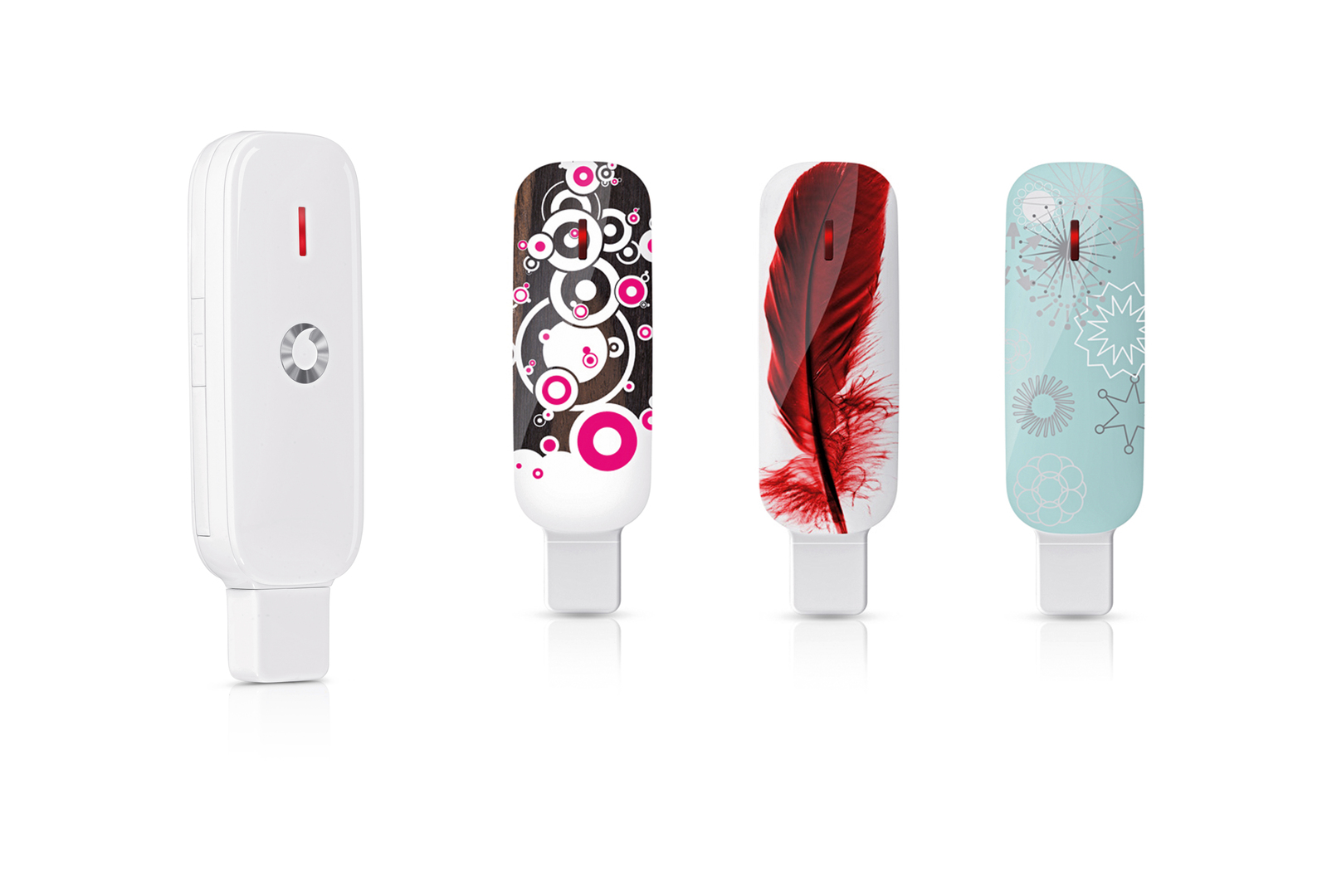 The K3806 mobile broadband stick has exchangeable caps that users can configure according to personal taste. Through an online platform, various colours and graphics may be selected. Moreover, users can upload personal photos which are then printed on the housing shell. The product thus succeeds in departing from the uniform appearance of a mass product.