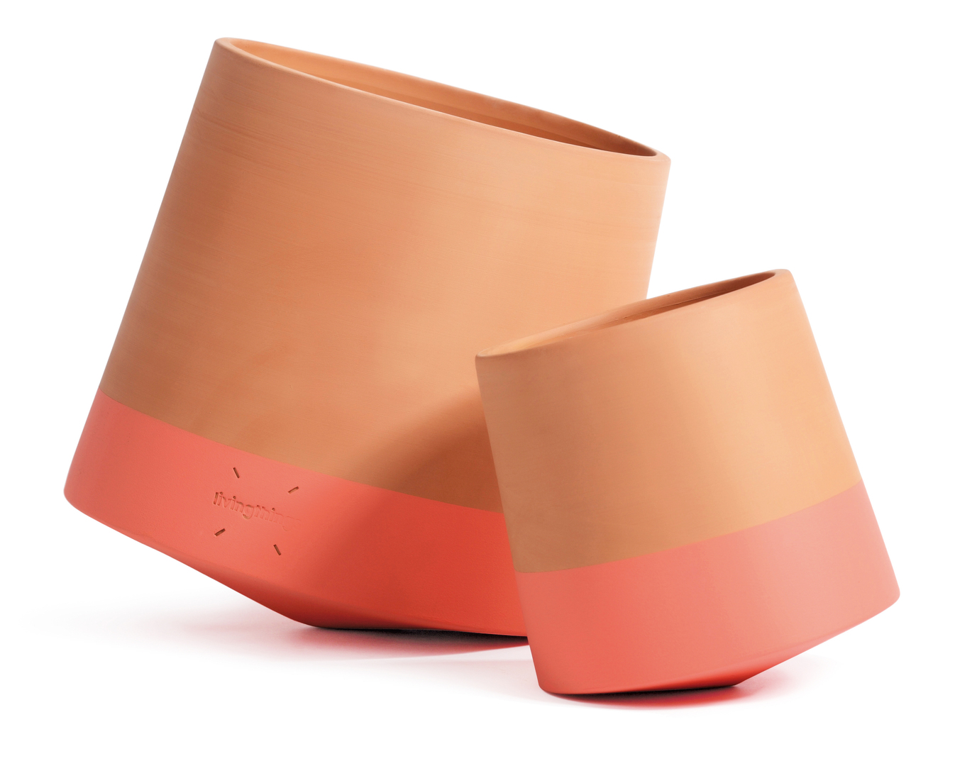 The Voltasol flowerpot has a conical base that allows the plant to face the sun at any time of the day by means of slight movement. A simple rotation on the axis of the pot increases the amount of sunlight and thus promotes the growth of the plant. The terracotta planter comes in two sizes and is available in white, yellow or salmon in its lower part. The matching bottom tray comes in the respective colour of the pot.