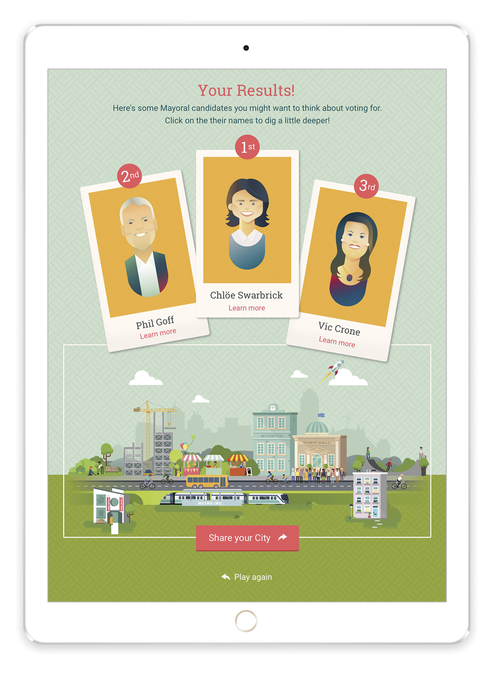 The core function of VoteLocal is to illustrate compatibility between the user and the candidates vying for their vote. What is particularly unique about VoteLocal is its visual style. It is engaging, fun and accessible while maintaining the integrity of the context and content. The style is unique among the expected visual vernacular of New Zealand politics, and is a key part of the tool’s ability to engage a primary audience of marginalised 18- to 24-year-old electors.