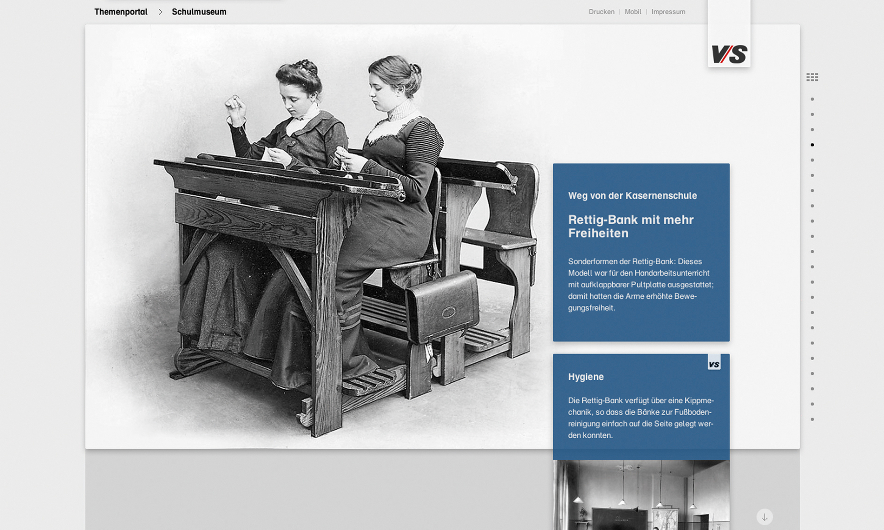 Accompanying the permanent exhibition at the VS School Museum in Tauberbischofsheim, Germany, this microsite presents the “digital classroom” as cultural history. Historical photographs, drawings and film documents explain the development of the classroom from the end of the nineteenth century to the present day. Users discover innovations within the school system and gain insight into the collaborations of pioneering designers over the last 100 years. Individual exhibits and architectural models are visualised from a 360-degree view.