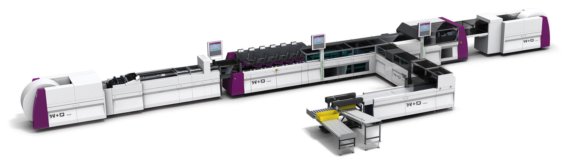 The W+D Timos is a totally integrated mail output solution designed for the personalised production and printing of envelopes; it also features automated inserting of the accompanying letters. Its modular housing reflects the individual workflow steps. Large glass hoods and partial glass fronts provide an excellent view of the production process running in opposite directions on two levels. Furthermore, the operating terminals enable intuitive process control in every area of the machine.