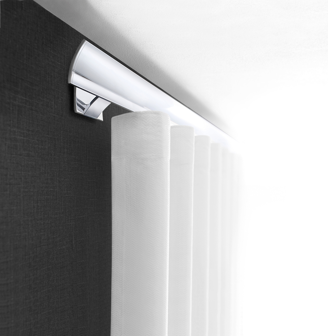W1 is an innovative hanging system which enables effortless movement of long, wavy curtains. A wave tape pushes the connecting cord between the newly developed gliders. Thanks to their concave panel, the largely dimensioned profiles visually harmonise with the generous depth of the folds. Rotating gliders and an infinitely adjustable reset brake make it is easy to mount and handle the system.