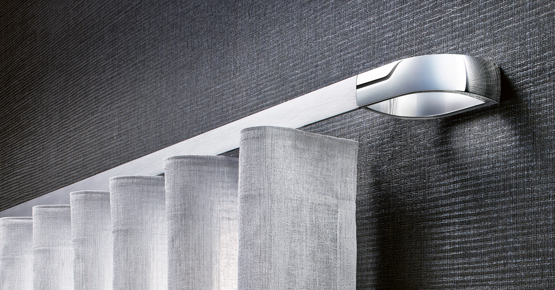 The slightly convex W4 traversing profile is both simple and elegant. What is notable about this curtain traversing system is that the special, organic-looking construction of the wall brackets creates a fluid transition to the profile. The interplay of the high-gloss wall connector with a track of matt silver creates an expressive appearance which allows the system to blend seamlessly into contemporary interiors.