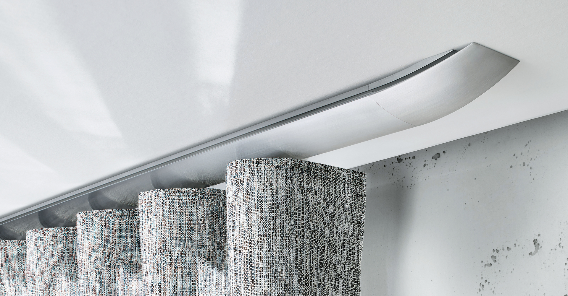 W5 is a curtain traversing system whose minimal depth allows for an elegant, but snug fit to the ceiling. Despite the low height, it includes a concealed track channel which even has sufficient space to reliably hide the cords of the complex glide mechanism. The small groove on the visible side of the track accentuates the convex profile shape which tapers off towards the wall. The finials continue the design of the profile and form a harmonious unit with the ceiling.