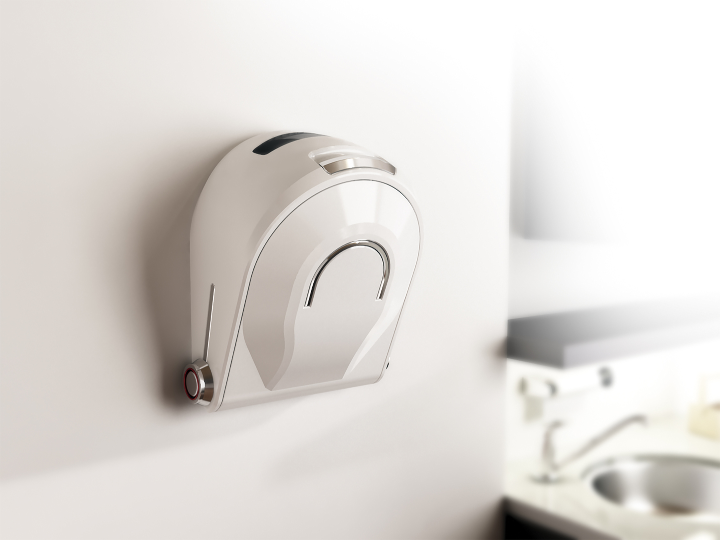 This oven is very simple and intuitive to use. When not in use, it is folded up against the wall and its compact volume barely takes up any air space. To heat up the food, simply release the external door, which comes down like a tray, then place the food on this tray and pull down the microwave cover to close. From here, simply set the cooking time and method on the touchscreen and press start. When the process is completed, pull back the microwave cover, remove the food and lift the tray back into position to close. It only takes a few steps to heat up the food and “keep away” the microwave oven. As some parts of the microwave oven can be separated, this also makes it convenient to clean.