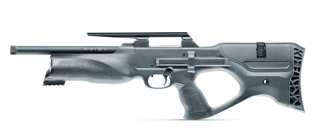 The compressed-air rifle Walther Reign stands out from the competition by its short bullpup construction and impresses with its low weight of only 2.6 kg. Thanks to sophisticated technology, it hits the target precisely. The rifle, made of high-strength aluminium and furnished with a premium black surface, adapts to the body with its ergonomic shape when it raised to the shoulder. The tensioning lever can be operated comfortably and intuitively by both right-handed and left-handed users – for both, the appropriate version is available.
