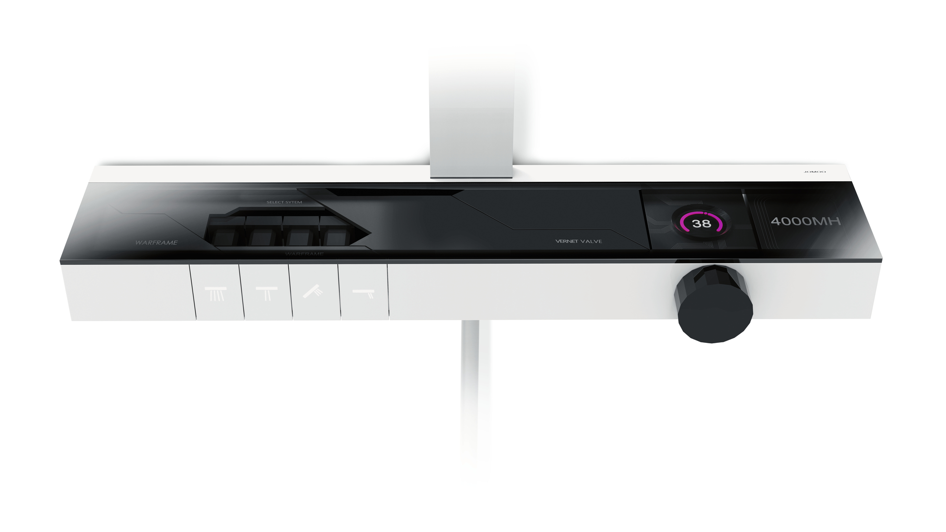 WARFRAME is an intelligent shower system with a generously designed and fully visible valve body solution. A large screen provides the user with a concise overview and control of the switching system, the temperature control system and the power supply. The high-precision internal mechanisms use sensor data analysis and user input to evaluate user behaviour. The combination of the geometric design language with classic white and black lends this shower set a scientific, technological appearance.