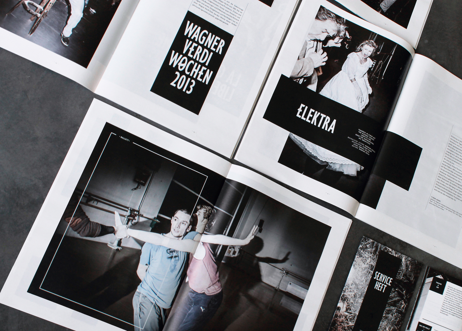 The title of a state theatre’s seasonal programme booklet – “Warte nicht auf bessere Zeiten!” – reflects its agenda, presenting a theatre that defies the funding cuts affecting the cultural sector. A distinctive feature of the coherent design is its typography, which has been supplemented with graphic characters. Interrupting the linear appearance of the headings, they have a distorting effect. The colour concept of the photographs taken at rehearsals, which were shot from unusual angles, evokes the atmosphere of a thunderstorm.