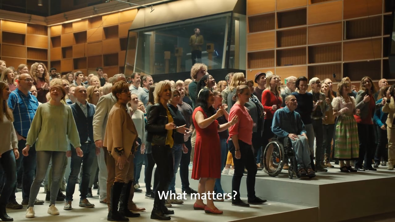 In its 2019 Christmas campaign, ARD made a plea for solidarity, raising the question “Was ist Deine Geschichte?” (What’s your story?) and focusing on what is especially important at Christmas: the community. For the main clip, 300 people from all over Germany were invited to sing a song especially written for this event while standing on stages arranged as a map of the country. The video premiered on the first of December 2019, just before the evening news, and was aired on all other ARD channels and social media afterwards. It was accompanied by portrait stories featuring individual singers, all linked by the song. The invitation to sing along and participate gave rise to a variety of contributions.