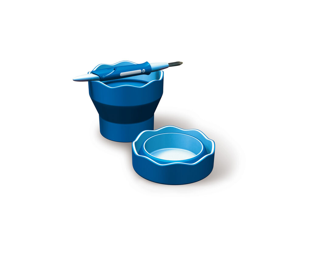 As an expedient accessory to the paint box, this water cup – with its large base made of non-slip material – is suitable for school and leisure activity. Its innovative folding mechanism simplifies space-saving storage and transportation. The wavy rim of the cup serves as a brush repository; therefore brushes used for painting have their own designated place and cannot roll away. The robust cup is easy to clean and also dishwasher safe.