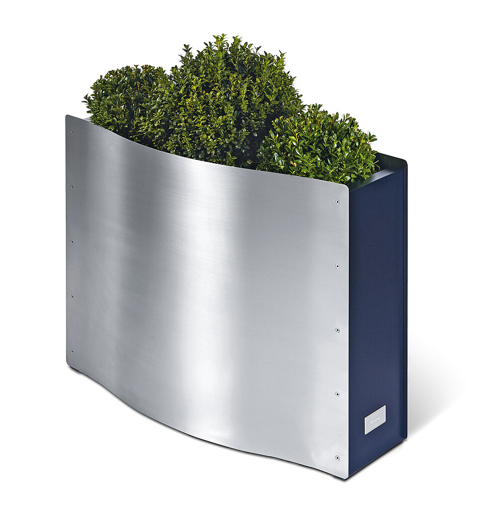 The Wave planter features a design of curved lines and is both suitable for outdoor and indoor use. Integrated LEDs illuminate the lower part of the planter. Its long sides are made of stainless steel while the short sides are available with an optional black, red or white coating. The plant containers are designed to create an architecturally impressive room division when placed in a row. The riveted accessory features two handles for convenient handling. Wave is produced with the dimensions 800 x 330 x 605 mm.