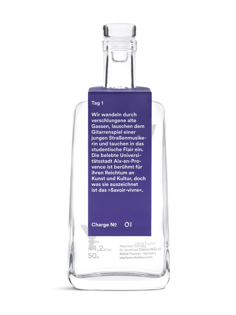 Wayfarer, the name of a new gin label from Cologne, takes the consumer on a journey to the south of France. Lavender, thyme, rosemary, basil and sage are the notes that dominate the smell and taste of the brand’s first gin, “Provence”. The logo undulates around the shapely bottle like a winding path and enables the observer’s eye to explore its course. In a shade of purple that evokes the lavender fields of Provence, the label around the neck features excerpts from an amusing travelogue that vary from bottle to bottle. With its clean lines, the design deliberately sets itself apart from the ornate look of its competitors.