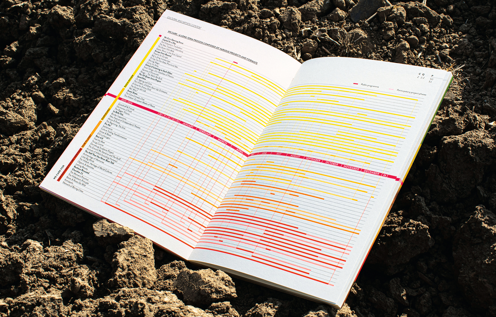 “WE CARE” is the main theme of the application for the title of Capital of Culture 2025 of the city of Hildesheim. The publication visualises this with an aesthetic developed from contour lines in cartography. A neon magenta line runs dynamically through the book, complemented by accents in two other neon colours. To intensify the effect, the neon colours were printed in double colour. The cover, made of cardboard with a very high wood content, shows a beet and a rose connected by laser engraved contour lines. The book has coloured pages, which create a luminous effect when turned.