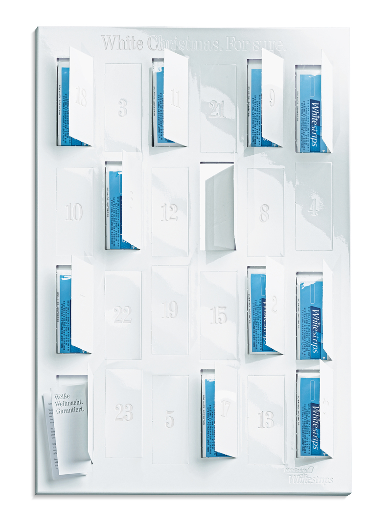 This giveaway, which was distributed at selected chemists and pharmacies in the pre-Christmas period to increase costumer loyalty, plays with the image of a white Christmas. It is designed in pure white; even the embossed numbers on the doors do not interrupt the monochrome look. Behind every door are two blend-a-med Whitestrips, which – if used over the entire Advent season – are to provide snow-white teeth. With the help of a small mirror which is behind the 24th door, the result can be checked.