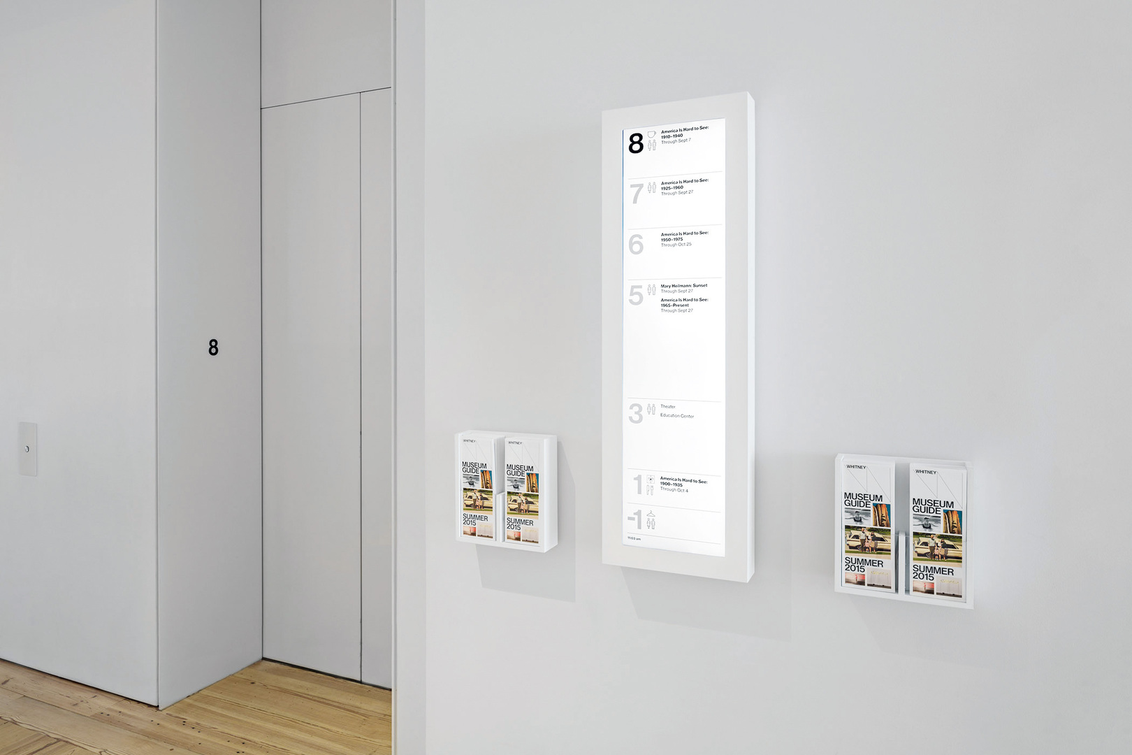 The challenge in developing the wayfinding and identity signage for the Whitney Museum of American Art was to extend the brand with enough restraint to keep the museum environment simple, elegant and timeless while not competing with the art. Whitney’s “Responsive W” logo is used as a graphic element to create a unique visual idiom for the wayfinding programme. A flexible typographic grid is based on this logo, consisting of graphics that incorporate arrows, which act as “containers” for directional information. The monochromatic colour palette is based on black, grey and white, while the type plays a secondary and complementary role.