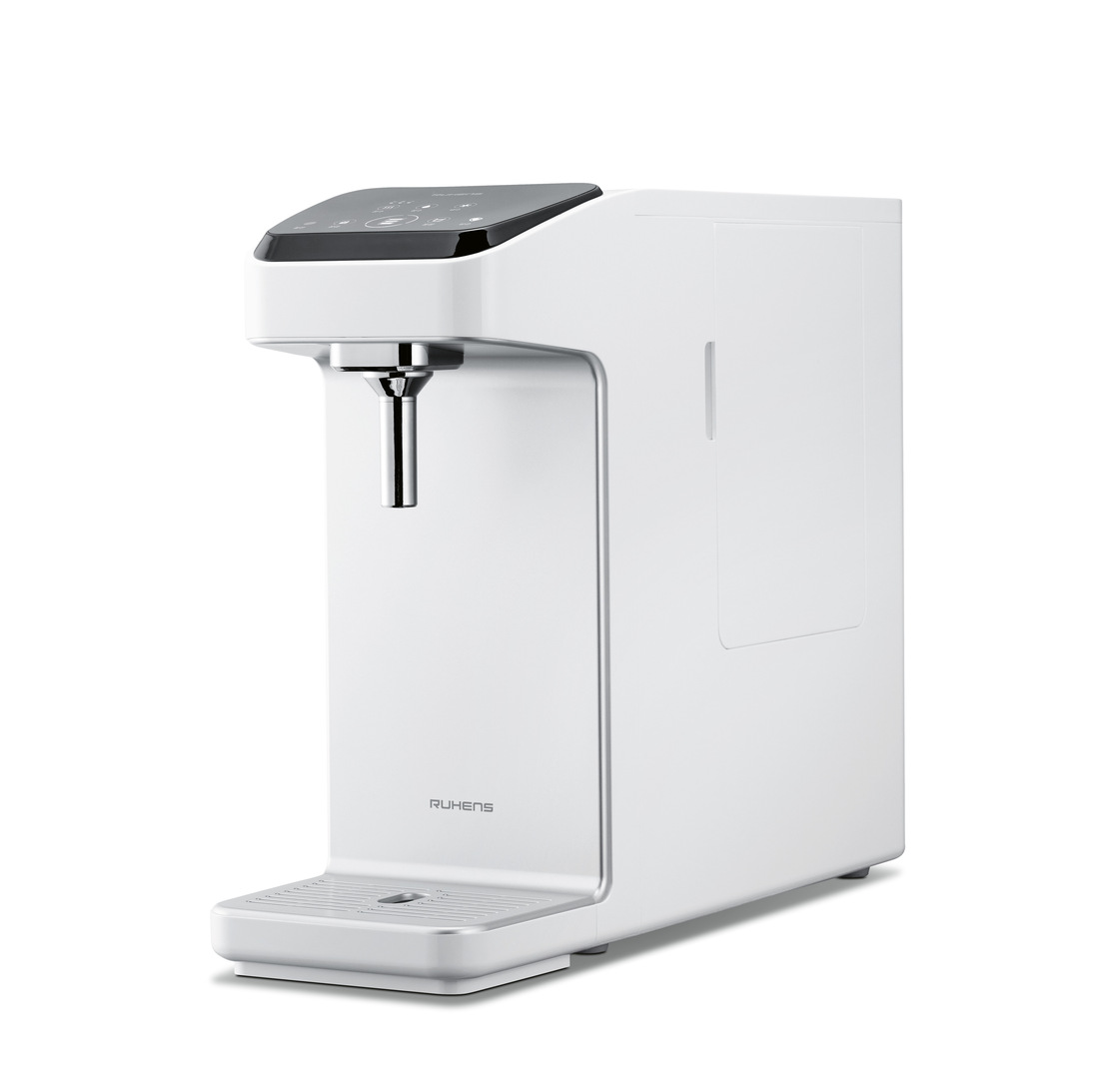 With a width of 18 cm, this water purifier is very slim and takes up little space. The device works very hygienically: it prevents input and output water from coming into contact with air or foreign bodies. Via an airtight connector, the water is supplied directly into the filtration system where it is extensively processed. The outlet is kept sterile by UV-LED light. Thanks to a quick-heating system, the water can be heated to 40, 70 or 80 degrees Celsius.