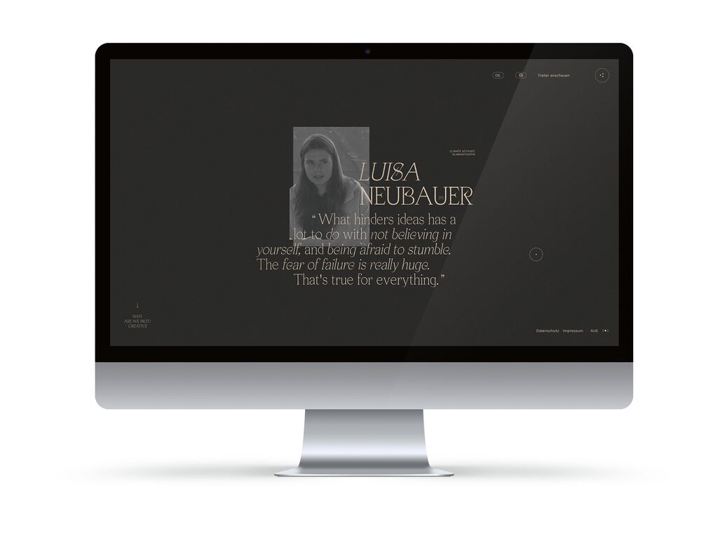 For 30 years, Hermann Vaske has been interviewing brilliant people about their creativity: What makes them creative? What hinders their creativity? The results of the research are now presented on a website that features unique navigation. When scrolling down, statements regarding inhibited creativity appear, when scrolling up, the user learns about what inspires creativity. The creative area is marked by a bright background, while the non-creative testimonies are presented against a dark background. The fact that creativity and non-creativity nevertheless belong together is indicated by the use of a uniform font style and layout.