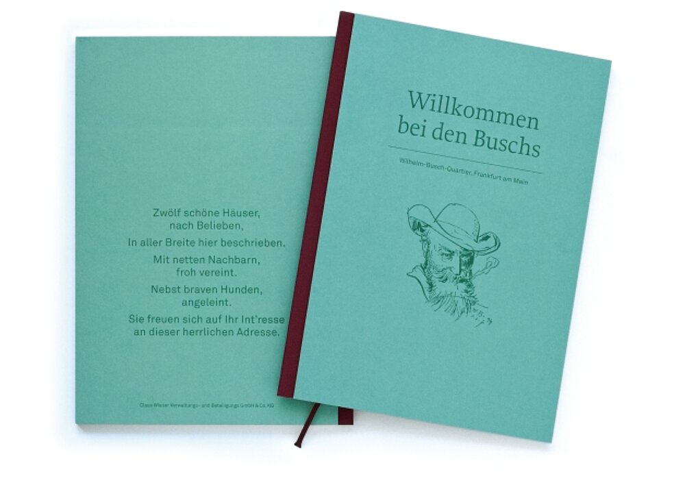 This unpretentious brochure is aimed at marketing condominiums in Wilhelm-Busch-Straße, Frankfurt/Main. Inspired by the address, the layout echoes the congenial visual language of the poet and painter and intentionally does so without any computer renderings. The protagonists reflect a representative profile of the current residents. People interested in an apartment in close proximity to Uncle Nolte or Master Lämpel are invited in verse to a personal meeting. The humorous design concept lends each piece of real estate its own character.