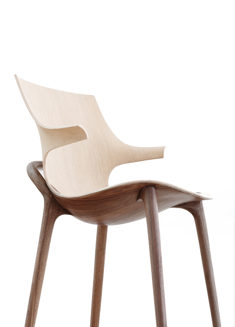 Committed to exploring how modern manufacturing methods can stimulate the innovative possibilities of traditional materials such as solid wood and veneer, the designer created the Willow Chair to showcase the purity and gentleness of the wood as much as possible. This chair is both comfortable and charming thanks to the computer- generated hyperboloids. Danzer 3D veneer and an 8-axis CNC milling machine was used to help materialise this chair and emphasise the pure characteristics of the wood as much as possible. The logic of its ergonomic form dictates how the parts should be carved, bent and joined together. Just as willow branches sway in the wind, the curves running through the Willow Chair demonstrate the rare softness of wood.