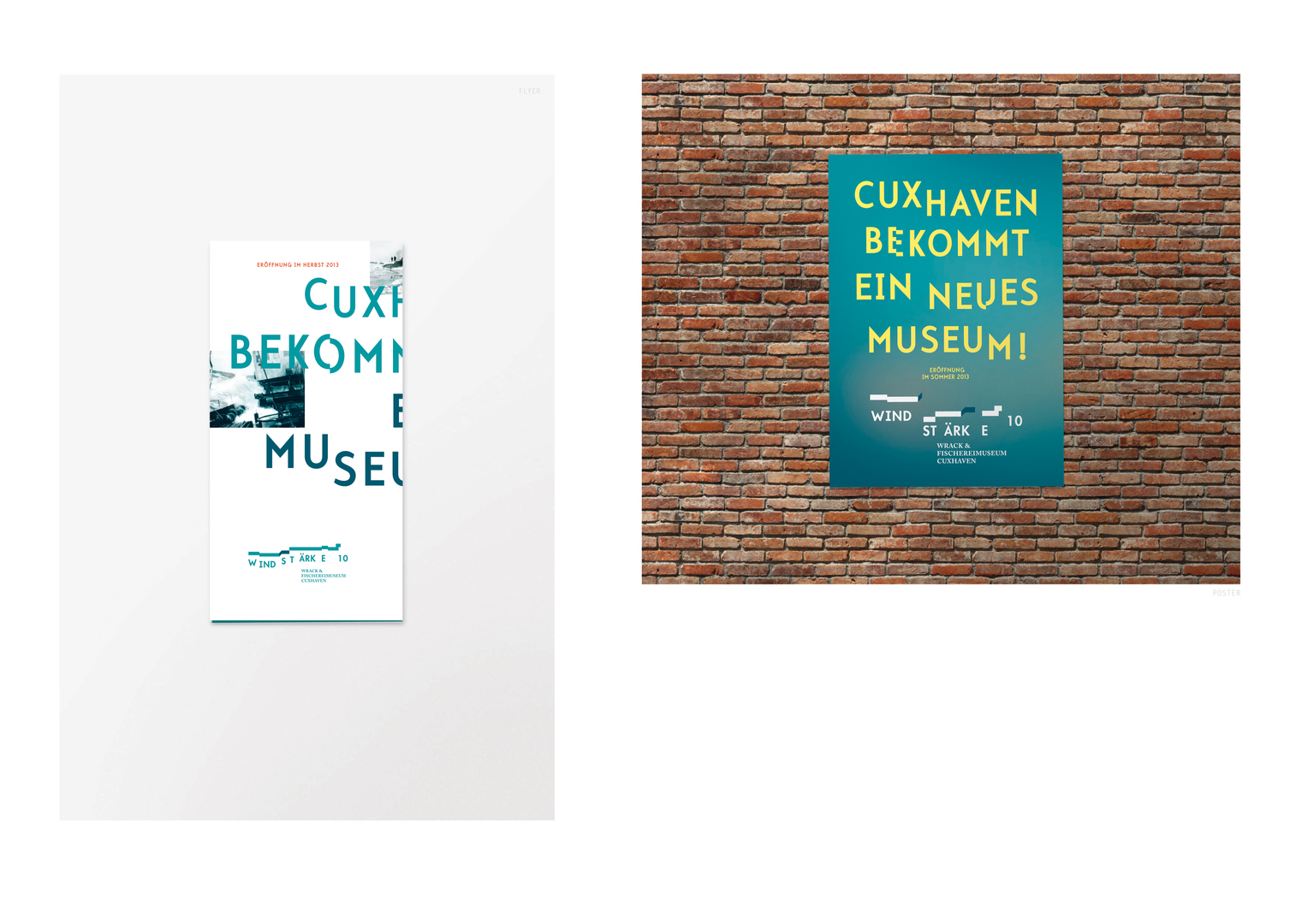 The corporate design of the Shipwreck & Fishing Museum in Cuxhaven is marked by maritime colours. The city of Cuxhaven, located on Germany’s North Sea coast, aimed to develop a distinctive appearance for its new museum opening in the landmarked fish market halls in 2013. The result is a flexible corporate identity, inspired by the museum’s location and name, Windstärke 10 (wind force 10), which visually reflects the changing wind forces from calm to hurricane. Even the appearance of the museum’s website changes according to both, weather and wind force.