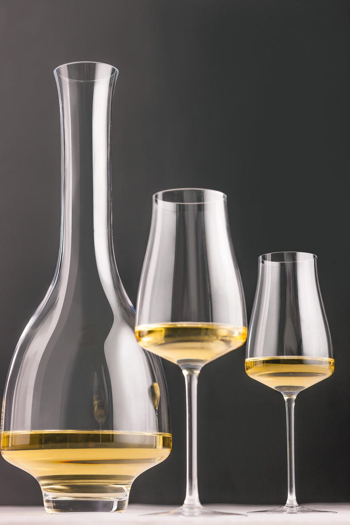 Wine Classics consists of 13 different goblet-shaped glasses and three decanters and was developed in cooperation with the International Wine Institute. The linear, concise form of the hand-made crystal glass series with its wide, reflecting surface and high, curved body (so called “chimney”) supports ideally the development of aromas in the glass. The filigreed walls of the glasses provide them with a special haptic and lightness.