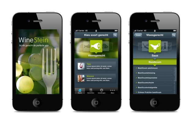 The WineStein iPhone app is a personal wine steward that provides the right wine for every dish. It was first launched in 2009, but the app was inefficient in use and the advice limited. Therefore a new information structure, navigation and look-and-feel was developed from the ground up. Also the icons are designed from scratch. The new app is designed with two common use cases as a starting point: easily choosing a wine in a restaurant or determining a highly detailed wine advice based on all ingredients and means of preparation of a meal. The search results can be filtered by price or – in the next release – by availability in local stores.