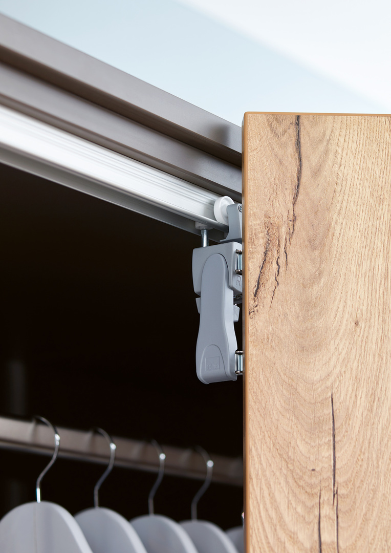 With the Push / Pull to move opening mechanism, folding wardrobe doors with WingLine L fittings open with just a simple hand movement. It does not matter whether the doors have a handle or not. The WingLine L fittings are suitable for doors measuring up to 2,400 mm in height and 600 mm in width. Door protrusion is minimal so that there is sufficient space for drawers and pull-outs. It is particularly advantageous that the fittings offer soft opening and closing which reduces noise levels even more.