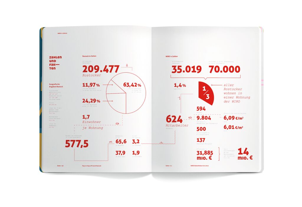 The annual report released by WIRO a large real estate company in Rostock consists of two books. The first book is entitled “Wohnfühlbericht” (Feelgood Report) and takes its readers on a city tour of the important “stations” of the past financial year in a hop-on hop-off manner. A rubber band incorporated into the cover holds the two books together and creates a connection between the entertaining part and the factual report. The books come in a red-and-white printed bag that takes the sightseeing feeling to a visual and haptic level evoking emotions associated with a holiday souvenir.