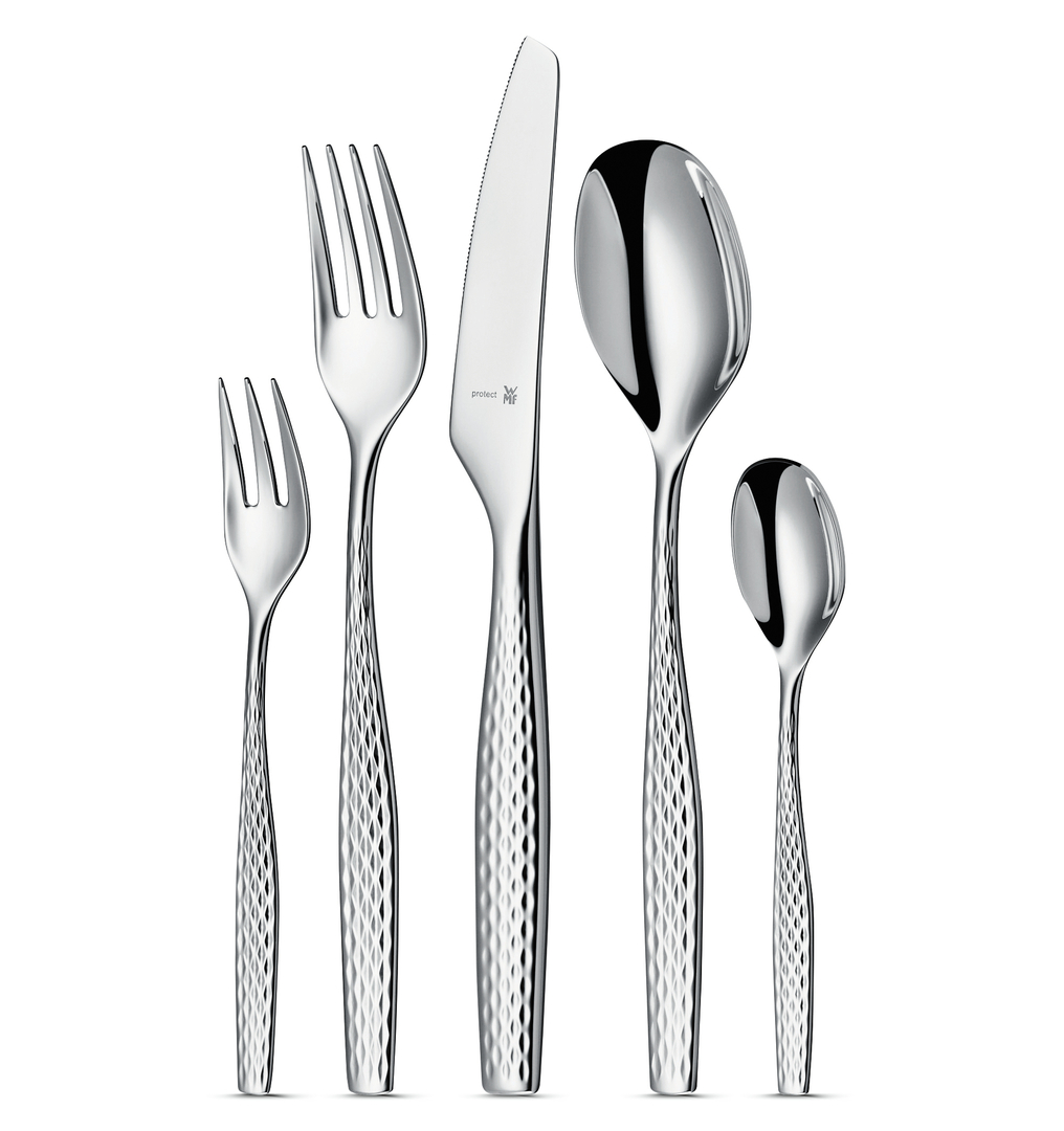 WMF Sentic combines rounded contours with a technical-looking diamond-shaped pattern. Its distinctive design features are the relief-like textured handles and their flowing transition to the smooth surfaces. This language of form unites all the cutlery pieces into a visual unity – from the forks with their filigree prongs and the knife with its striking blade to the elegant spoons. A patented surface finish makes the five-piece cutlery resistant to scratches and traces of usage.