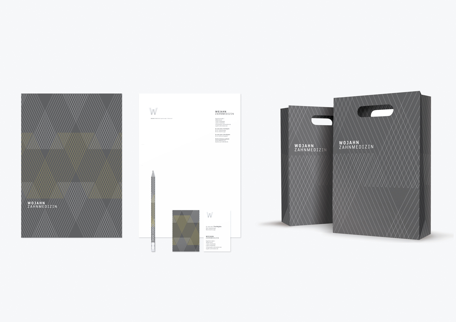 Wojahn Dental Practice provides a comprehensive range of dental treatments of top-class quality. The aim of the corporate design was to highlight the aspects of aesthetics, the long-lasting results and the efficiency of the dental care offered. The line structures used throughout the identity symbolise the multifaceted nature of medical care as well as an interface between man and medicine. Furthermore, the elegant and understated appearance of the design underlines the high standards of the dental practice.