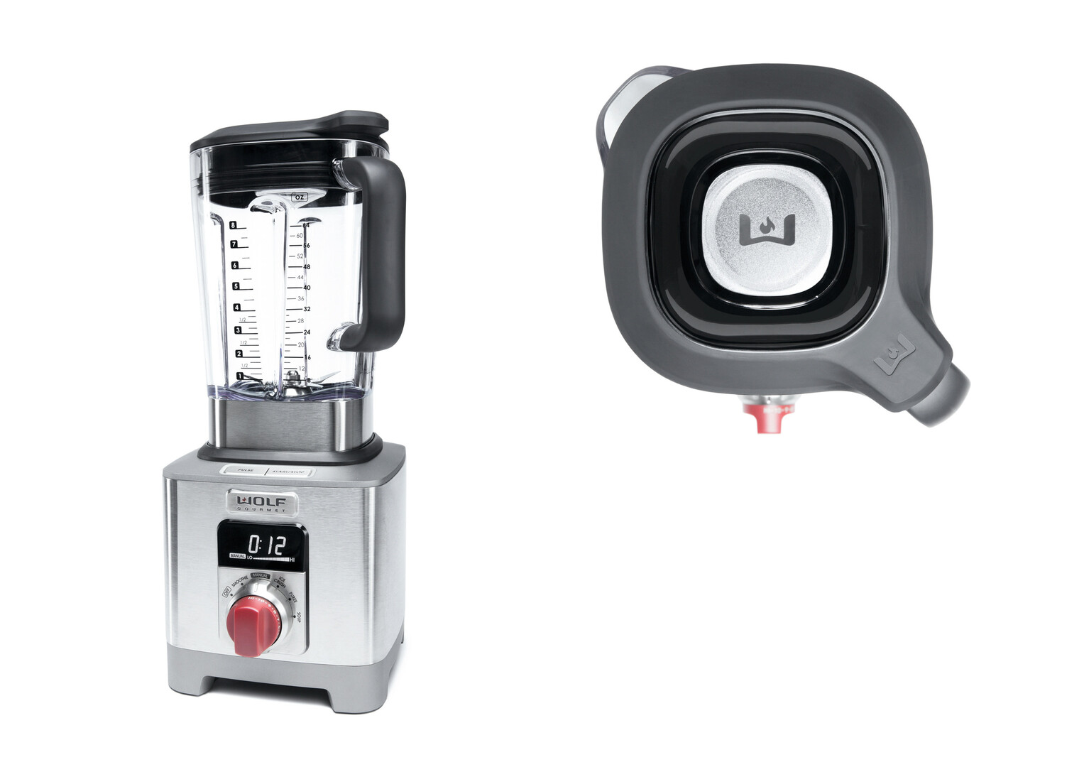The Wolf Gourmet Blender is a blender with a concise appearance which is characterised by a reduced silhouette, conspicuous handles and operating knobs as well as by the fusion of digital and analogue technologies. A powerful motor with 2.4 HP drives the cutting blade revolutions to over 300 km/h in order to assure optimal blending results, even with fruit sorbets and nut butter. The speed can be regulated stagelessly by the rotary knob.