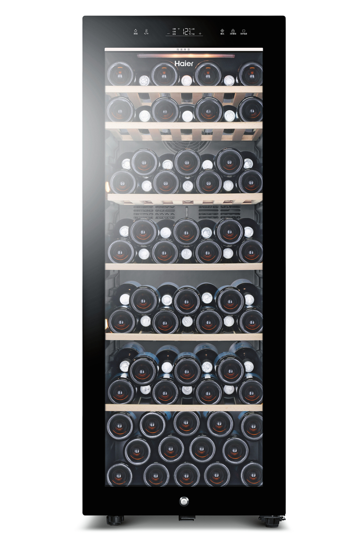 The wine cooler WS084U1 was designed for optimal storage of red and white wines. This is ensured thanks to technical details such as a yellow LED interior lighting. The warm light provides a wider lighting surface and minimises the impact of sunlight on the wines’ quality. The lighting can be controlled through a built-in WiFi module via an app. The adjustment of the operating mode can also be made via remote control. The wooden pull-out shelves are a further useful detail.