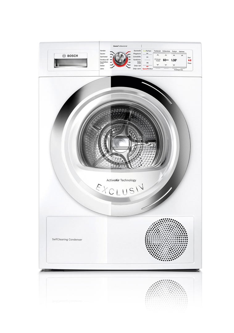 The HomeProfessional condenser dryer works with the energy efficiency class A and achieves additional energy savings of 60 per cent. Also, in the long run, the appliance operates efficiently thanks to its patented SelfCleaning condenser. It allows intuitive control via touch keys and an innovative TFT display. An exclusive chrome design, a symmetric basic structure, high quality materials and details, such as LED illuminated buttons, and the large door with protective glass enhance the aesthetic appeal of the appliance.