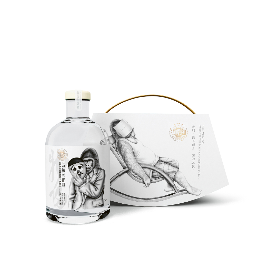 The idea for the packaging design for this distilled wine is based in the slogan “At this time, take off the mask, return to oneself”. Many people feel insecure as a result of the pressure created by the hectic pace of life as well as by family and work responsibilities. In response, they hide behind a mask. The label on the bottle visualises this scene with a black-and-white drawing of an ape in a suit, holding a clown’s mask to its face. In contrast, the outer packaging provides a brief respite. It features a refined design with a rounded base, imitating the shape of a rocking chair in which the ape is sitting.