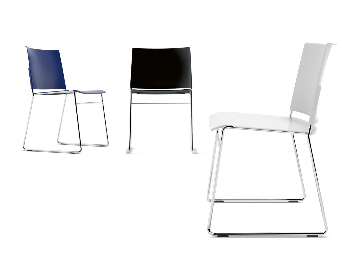 X is a reinterpretation of a stacking chair which combines functionality and comfort in a clean, appealing design. Due to innovative construction, up to 60 chairs can be compactly stacked. This means almost 1.5 times the stackability when compared to conventional models. The chair consists of an elegant pipe steel frame and a flexible seat made of thermoplastic polyolefin (TPO) which adapts to body pressure and is as comfortable as any upholstered piece of furniture yet easier to clean. The chair’s use of recycled PP materials is testimony to its ecological credentials.