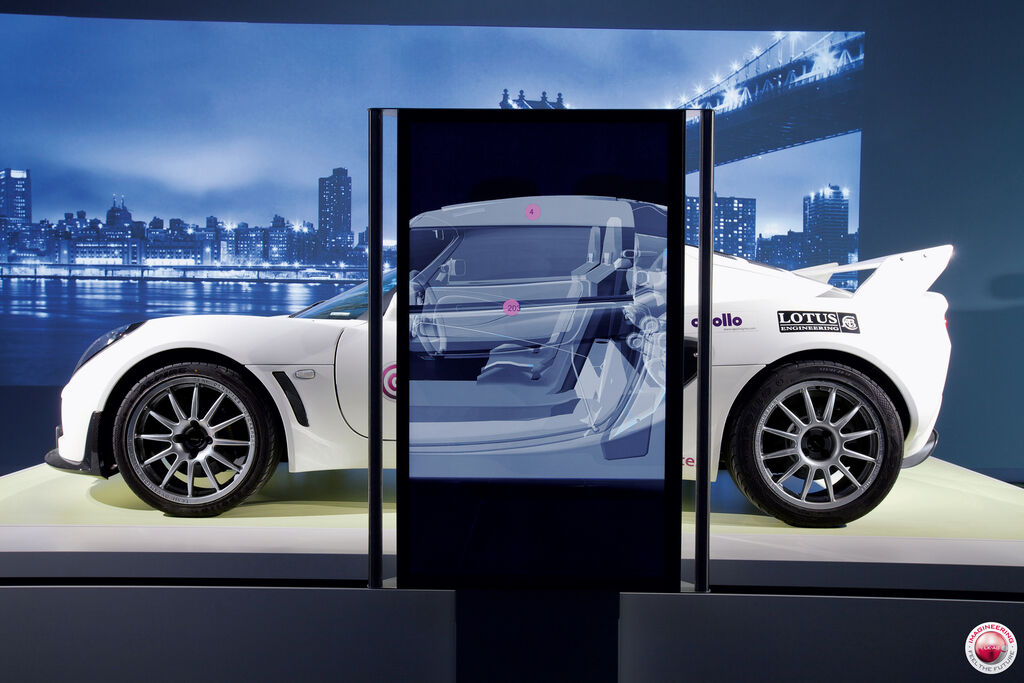 An unusual presentation technique was developed for Evonik Industries’ appearance at the “K 2010” plastics trade fair. The challenge was to explain how the plastic components of the car industry supplier, which are embedded in the car body and normally not visible, work. The solution was a movable touch-sensitive display which produced an “X ray” image in real time of the car’s interior, as well as information about the components.