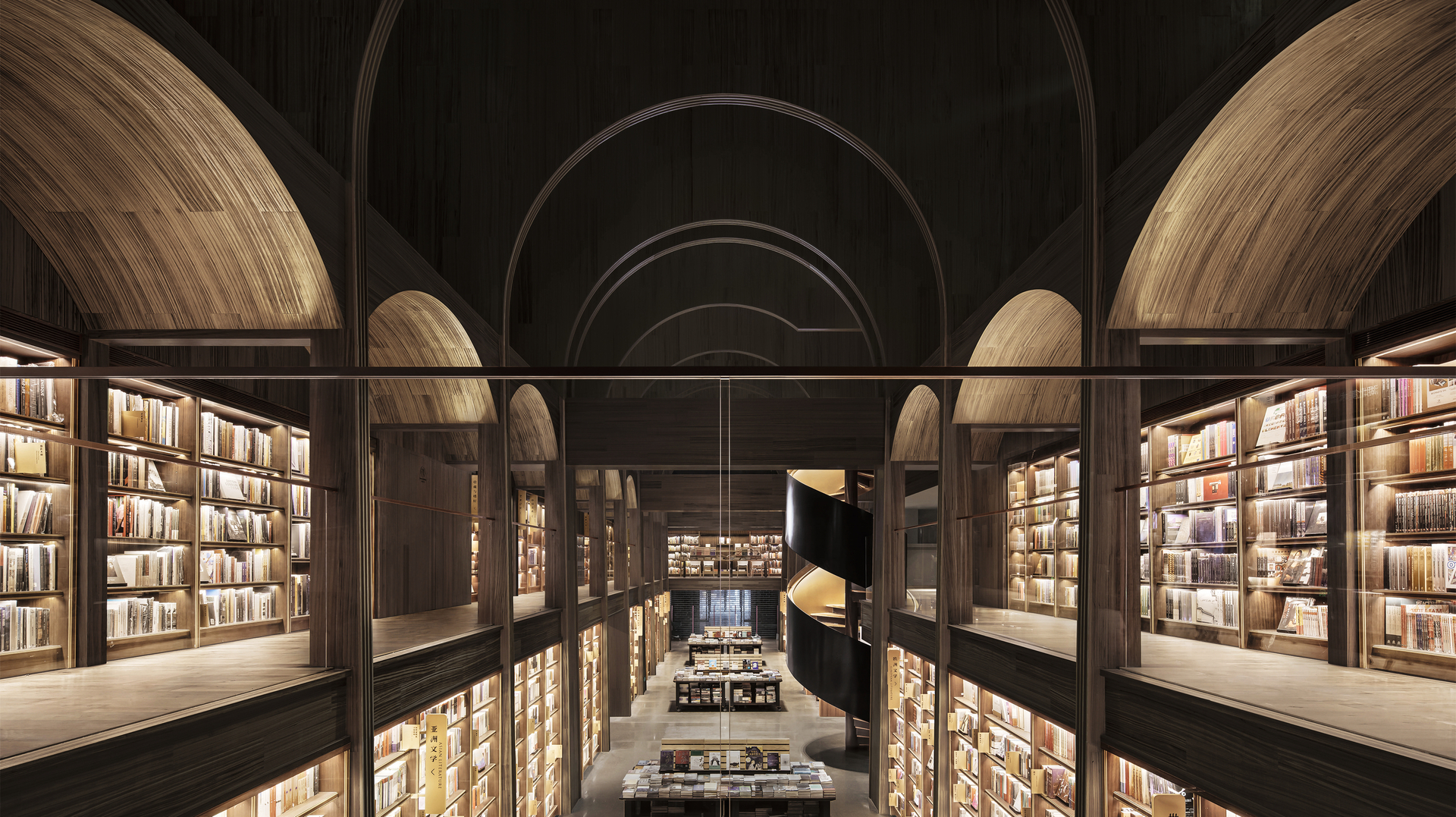 The design of this bookshop aims to create a close link not only to its urban surroundings, but also between people and books. The interior is divided into three sections. The East Building is a two-storey room, fitted with shelves, the sight of which is characterised by dark wood and arched constructions that resemble castle gates which symbolise the access to knowledge. The central section is dominated by a five-metre-high circular book tower as an eye-catcher. The West Building with space for display areas and eating facilities particularly serves commercial purposes.