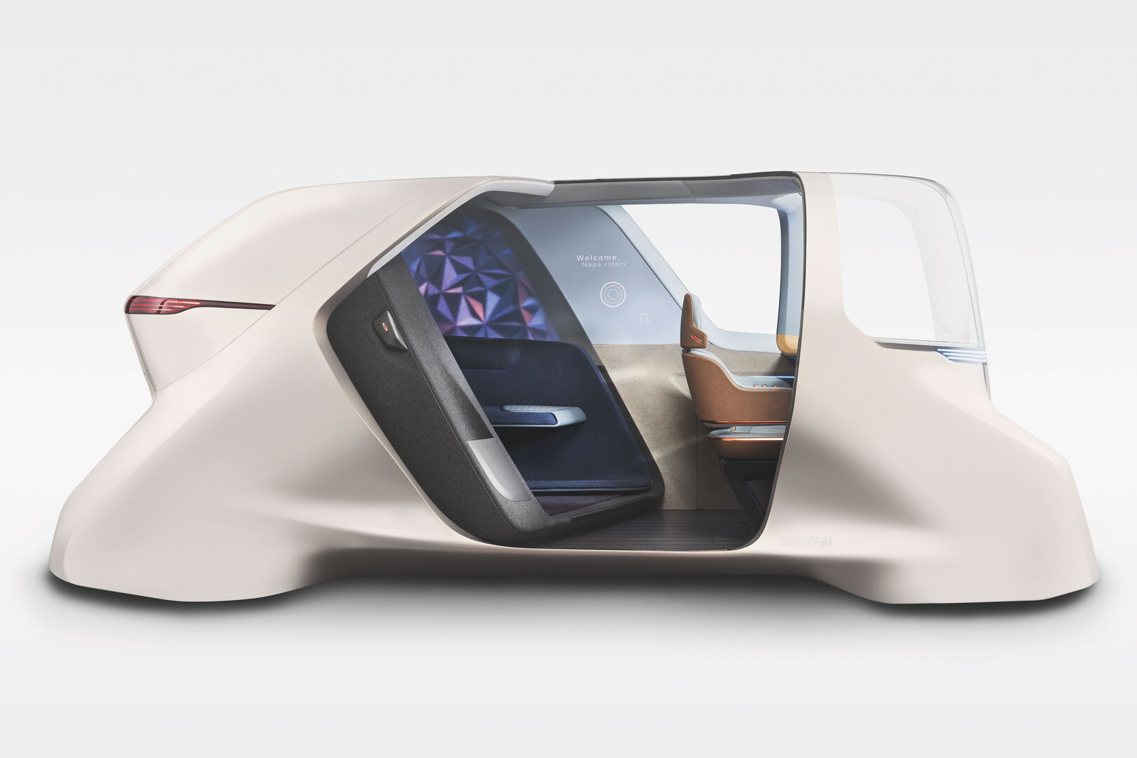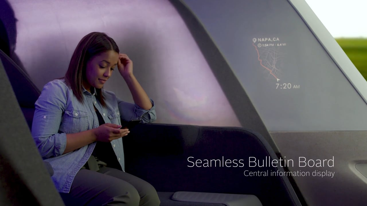 The front area is an observation space, offering comfortable, functional seating with an uninterrupted 180 degree view through the curved windshield. This zone is reminiscent of a cafe or coffee house bar, pressed up against a glass window to allow passengers to feel connected to the world while enjoying their journey. The rear seating area provides secluded comfort for passengers to retreat and relax. The space mimics the cosy atmosphere of a booth, with soft fabric surrounding and technology integrations designed to complement passengers’ moods and preferences.