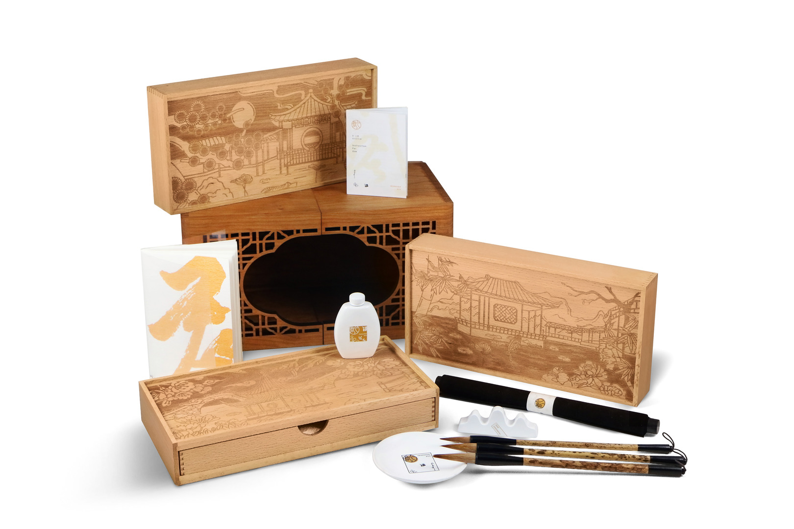 The special thing about this Chinese calligraphy set is the fact that there is no need for ink, paint or paper: instead, the user writes simply with water on fabric. When the water dries, the fabric returns to its original appearance. The environmentally friendly set consists of a large case with panels opening laterally. It holds a wooden box with three drawers which accommodate the necessary tools. In accordance with the design, bamboo, pine and Chinese plum flowers are used for the boxes, which are decorated with figures representing Far Eastern garden scenes and iconic flower symbols.
