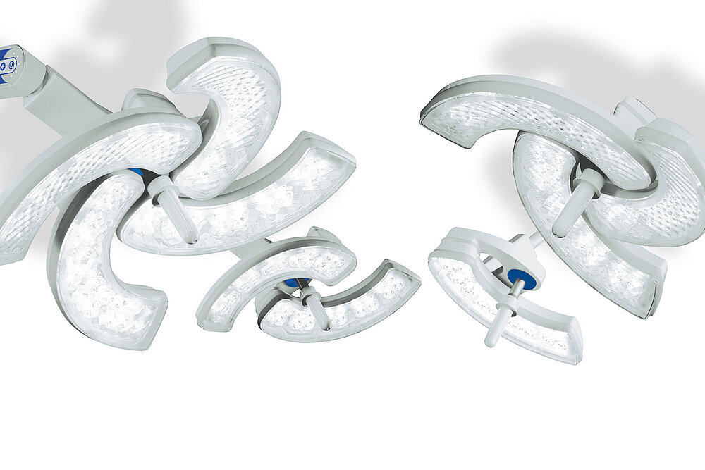 The unusual shape and dynamic appearance of the spotlights lends the XLED surgical light both a sculptural character and optimal functionality.