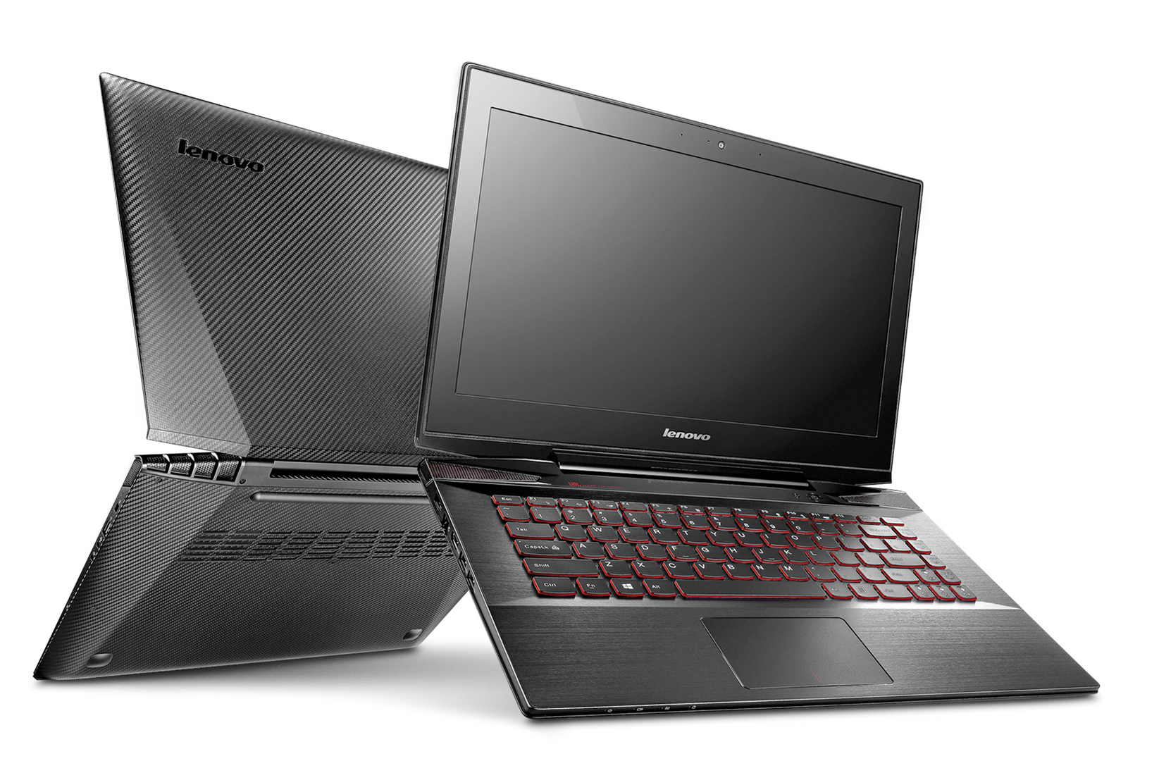The Y40 gaming notebook shows a design inspired by a sports car: the keys are framed in red, while the speakers are enclosed in red metal mesh. The chamfered edges at the top and bottom allude to the airflow running from the bottom of the device towards the back. The robust casing is made of carbon fibre, rendering the device durable, preventing fingerprints and offering good haptic properties.