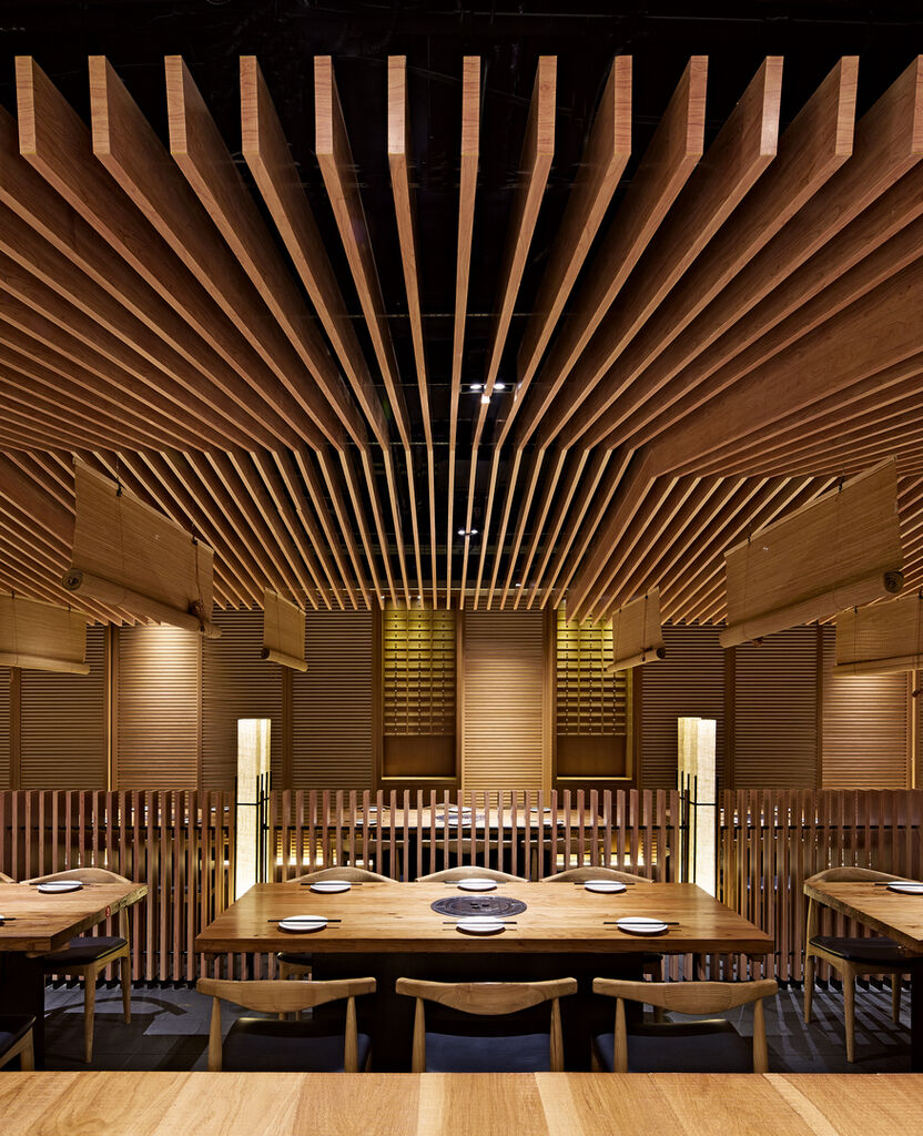 Strip-type partition boards made of wood laths, which are widely seen in Japanese architecture, were used in the construction of this restaurant. For its design, the owners were inspired by a picture from the renowned works of Utawaga Hiroshige: “Sudden Shower Over Shin-Ohasi Bridge and Atake”, which captures the moment when a summer rain shower suddenly changes the weather and surprises pedestrians. By presenting the rain as thick stripes, not only the Japanese painter’s technique was adopted but also a unique atmosphere was created.