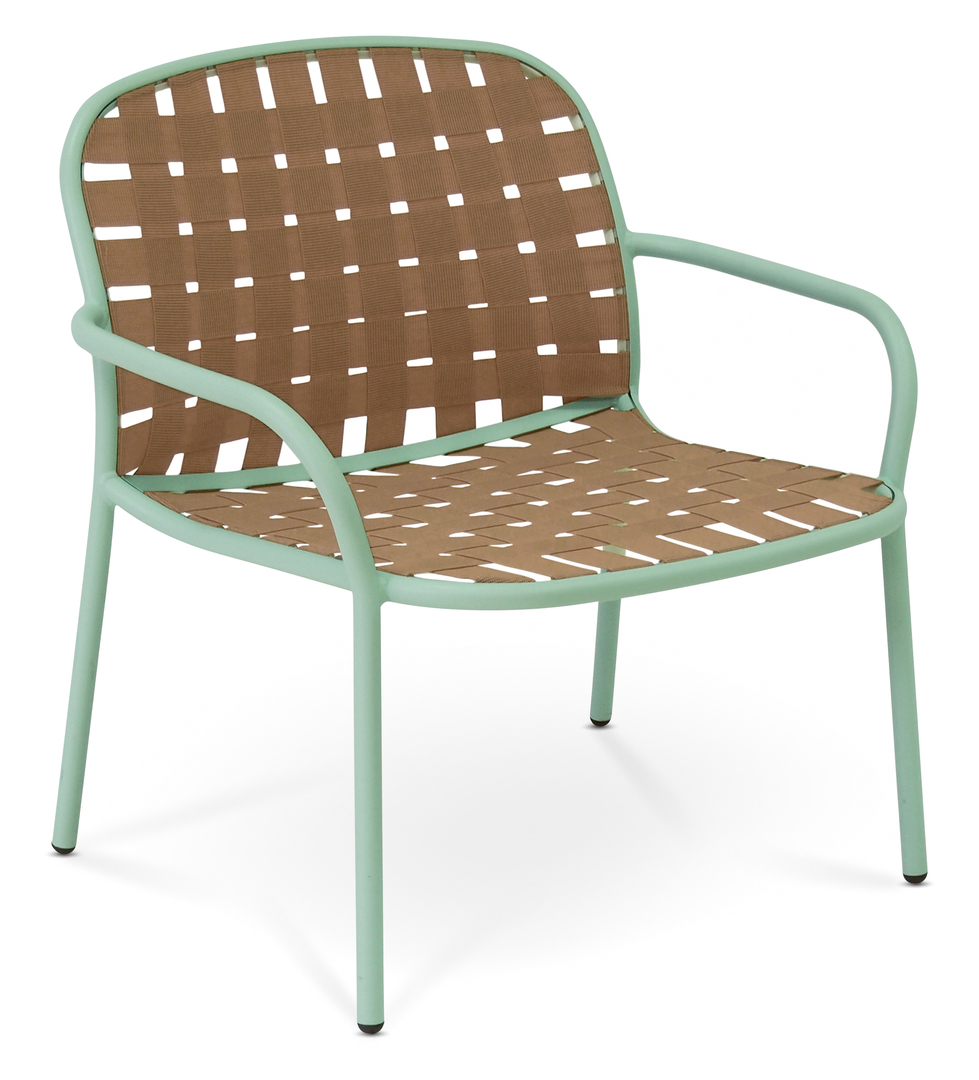 Yard is an armchair with a lightweight frame made of powder-coated aluminium. The elastic straps of the seat and the back guarantee a pleasant comfort even without additional cushioning. In an elegant way, the plaited straps are inserted flush into the frame. After years of use, the potentially worn straps can be exchanged if required. Yard is available in various colour combinations including black / grey, red / red, blue / blue or mint green / beige.