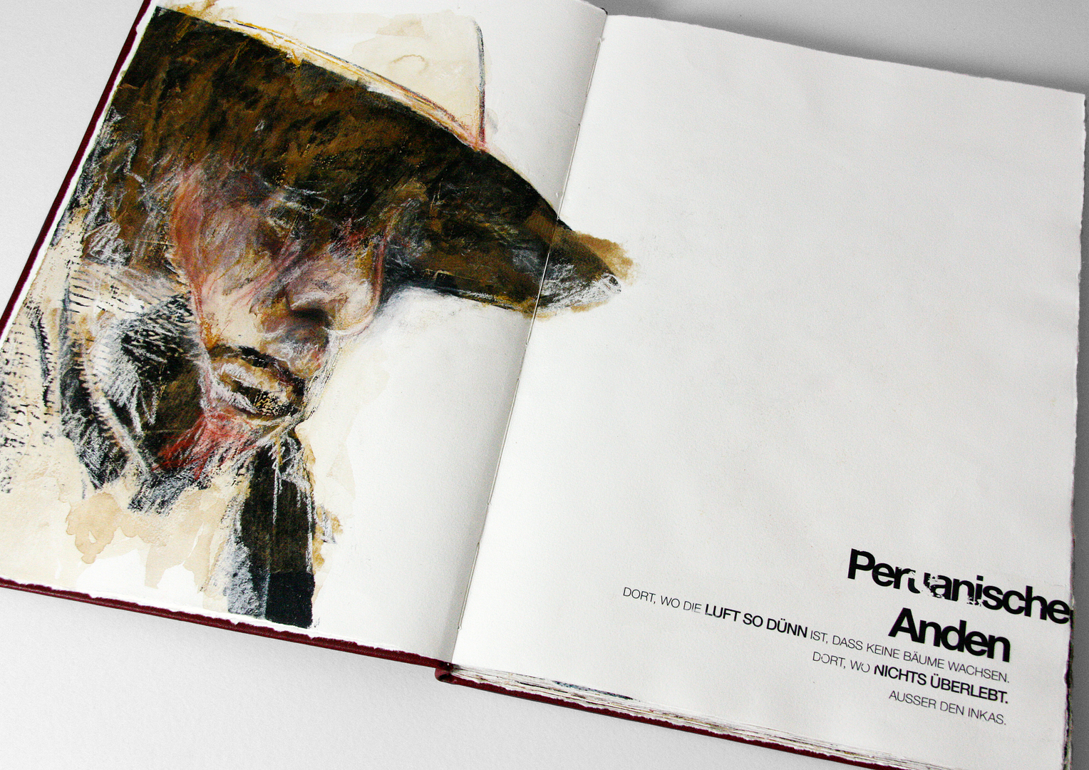The “Yawar Fiesta” is an annual festival and bloody ritual performed by the Inca for centuries in the desolate Peruvian villages in the Andes. In a subtle, controversial manner, it symbolises the vendetta against the Spanish conquerors. The work communicates this cruel ritual in a series of illustrations, mediating its drama and intensity: a wild condor is caught and given alcohol to make it drunk; in a kind of bullfight, it is then tied to the back of a bull and, in its efforts to free itself, the condor fights with the bull. The highly expressive appeal of the illustrations unfolds on double-pages, in A3 oversize book format. Showing mainly close-ups of the condor or the Indians further enhances the desired effect of dramatic intensity. The background to this bloody fight is provided briefly in the lower margin of the page. However, the illustrations are visually predominant. They build up an enormous tension, unfold-ing over 88 pages, and, at the same time, evoke a socio-critical approach with this controversial matter. Statement by the jury »On the one hand this work impresses by its consistently aesthetic visualisation of a fascinating story and on the other hand by the way it uses the materials. Its heavy paper and pastose painting style underline the strong expressive appeal of the illustrations by lending them an almost tactile quality.«