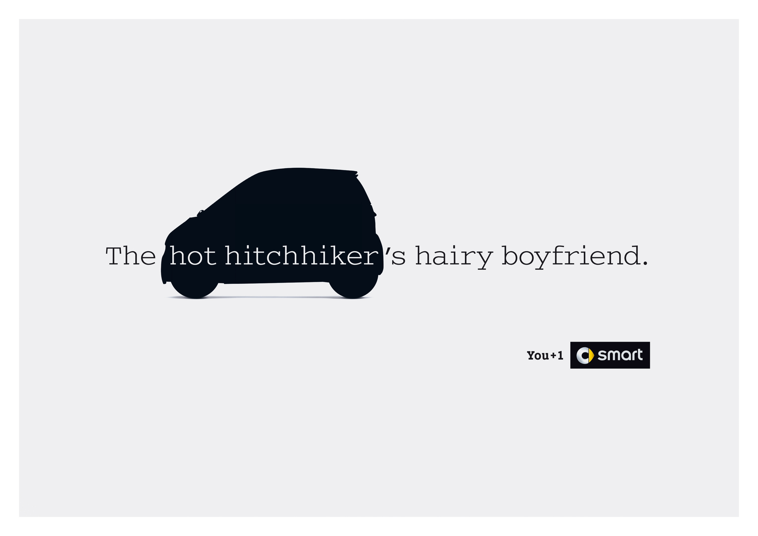 The print ad campaign for the smart fortwo is inspired by and builds upon the iconic shape and size of this car, promoting and underlining the car’s shape and size as its outstanding quality. The graphically reduced headline campaign lists various people who you would hardly want to take with you in your car, such as mother’s new boyfriend who insists on being called Dad or your partner’s cousin who is unable to keep the kebab to himself. Thus, it seems quite fortunate that the smart fortwo offers just enough space only for those people that you really want to take with you. These people are identified in white letters set above or within the monochrome black silhouette of the smart, thus illustrating the message “You+1”. The highly minimalist design solution for the campaign interrelates form and content in an original approach and thus manages to convey the message with sharp wit.